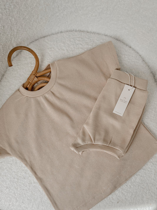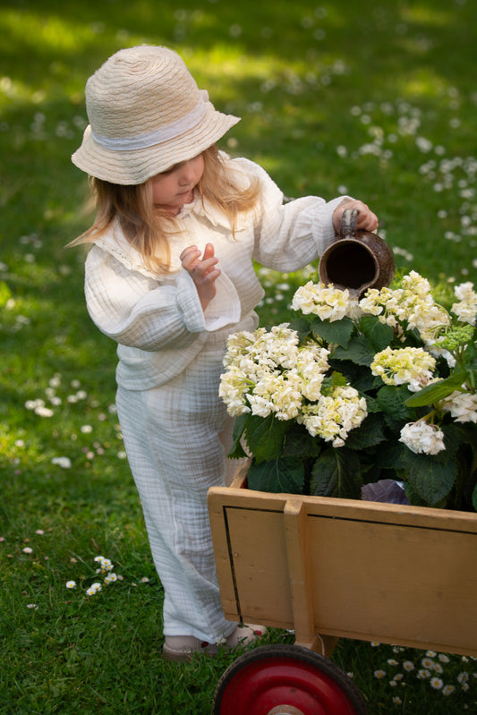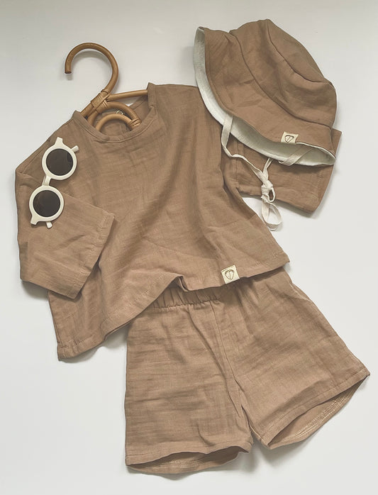 Neutrale bruine set | T-shirt en short van katoenen mousseline met zomerse hoed