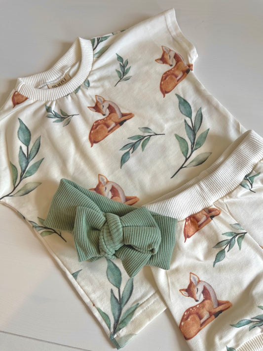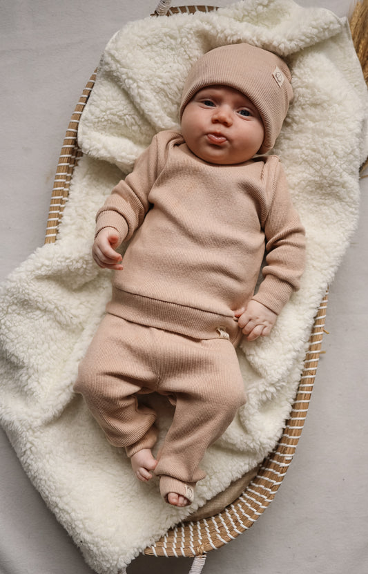 Baby katoenen top en broekje set met accessoire | Lichtbruin | 3 delig