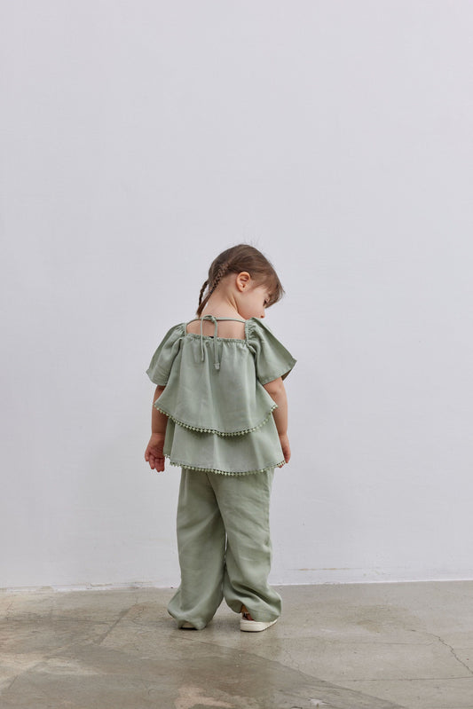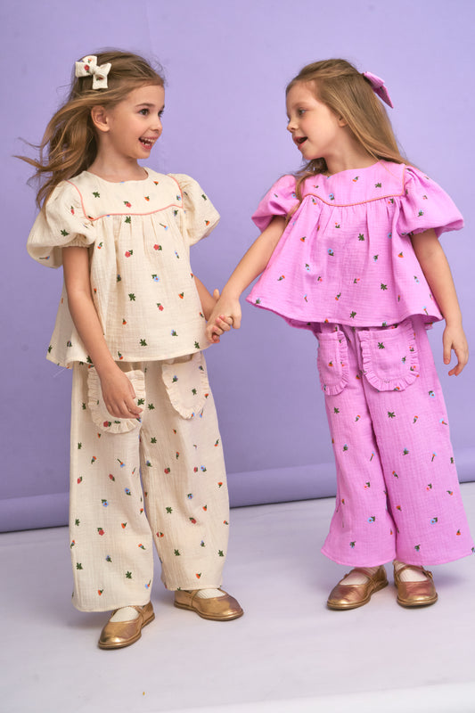 Meisjes Beige Mousseline Top en Broek set met geborduurde bloemen