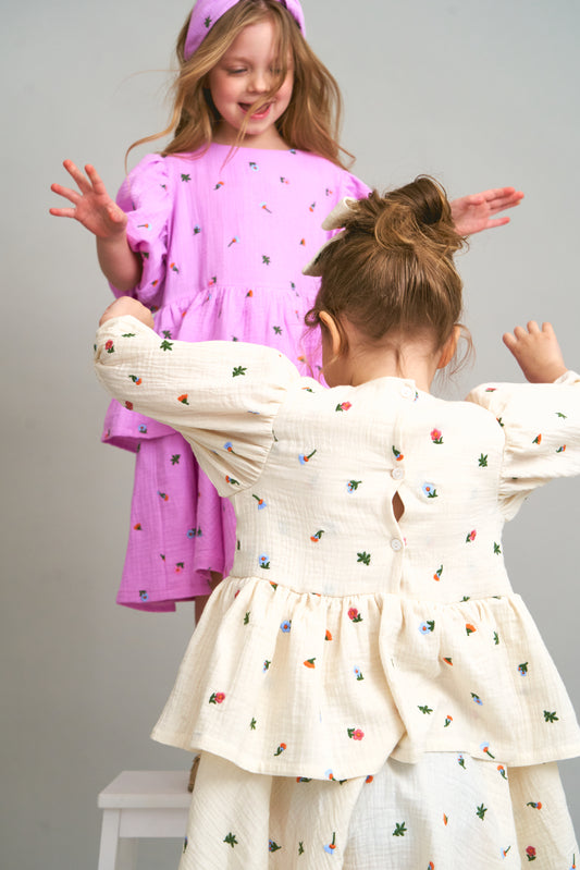 Meisjes - Crème tweedelige set van katoenen mousseline