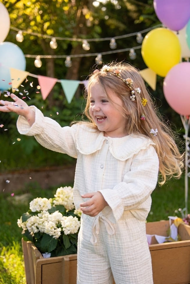 Geef de garderobe van je kleintje een upgrade met deze prachtige tweedelige set in een tijdloze ecru tint. Deze outfit combineert ultiem draagcomfort met een verfijnde, boho-chique uitstraling. Perfect als meisjes communie outfit, voor bruidsmeisjes, of gewoon als stijlvolle zomeroutfit.