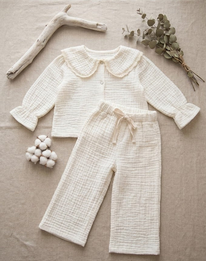 Luxe Meisjes Mousseline Co-ord Set in Ecru – Met Statement Kraag